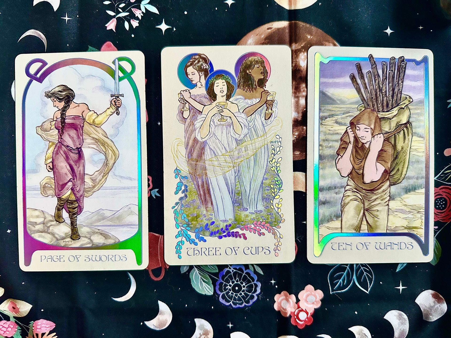 Card: Page of Swords, 3 of Cups, Ten of Swords